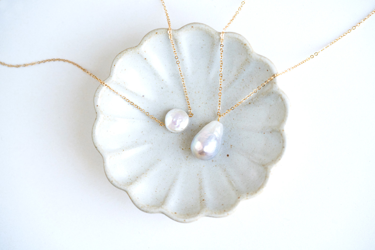 Pearls were our first thought to represent Pantone’s choice. We have a number of baroque pearl pieces in the store, including the coin and teardrop pearl necklaces below. These are are non-round pearl featuring a unique shape and a natural, organic feel.